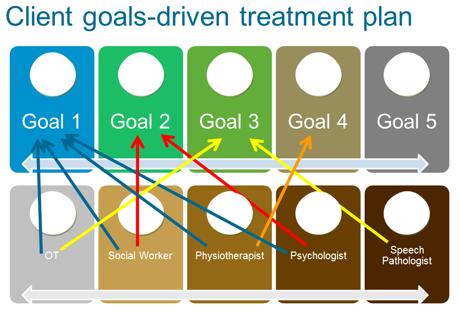 Using an interdisciplinary collaborative approach, client goals direct the action plan rather than individual disciplines identifying goals for the client specific to their role.